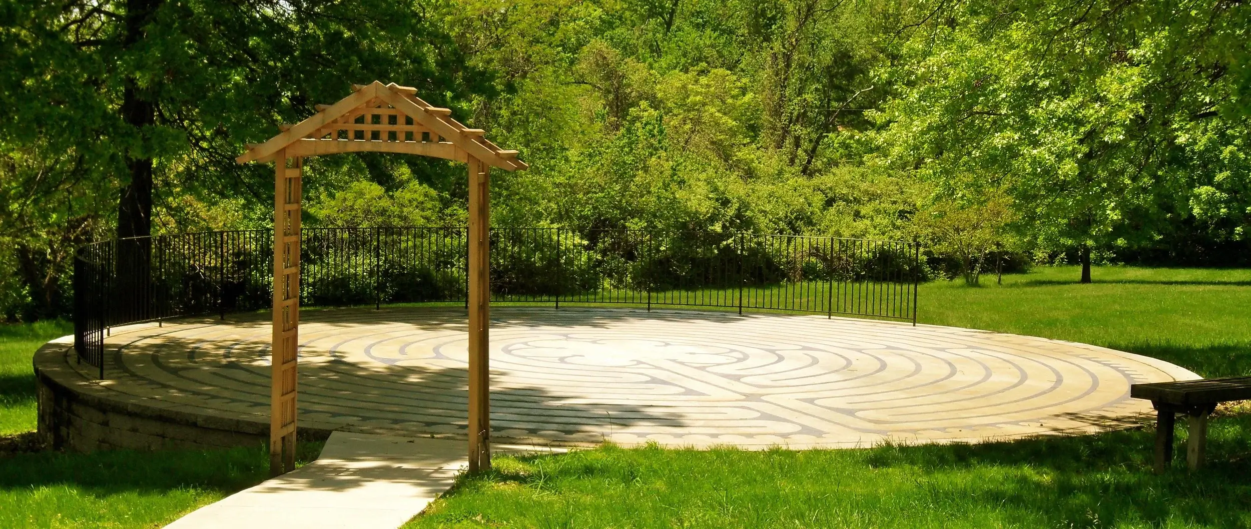 Finding the Labyrinth: When you pull into the long drive facing the church building, turn left at the fork and drive to the far end of our front lot. You will see a sidewalk and the posted placard, and that will take you to the Labyrinth.